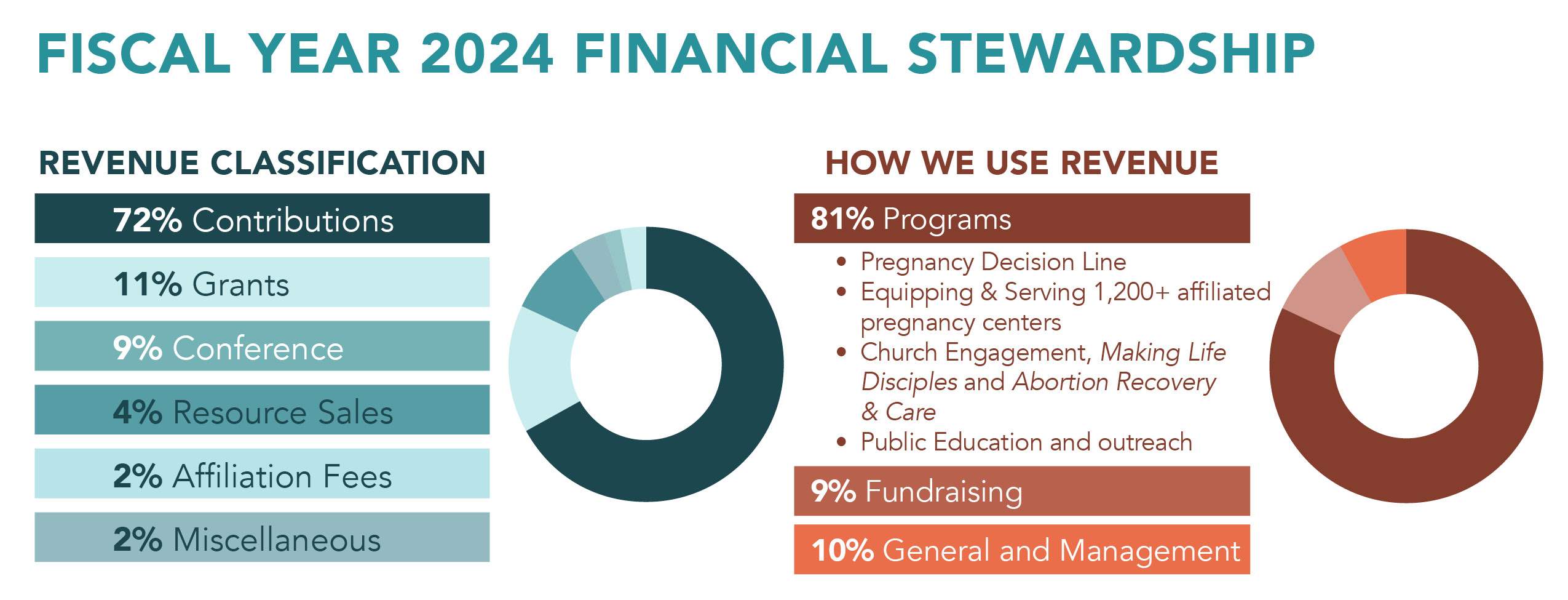 Moreover, we work to keep our fundraising and overhead costs at a minimum so that more of your gift goes directly towards protecting the unborn and building strong families to give women, men, and children the abundant life God has in store for them. Review the information below to see an overview of our income and expense breakdowns for the last fiscal year.